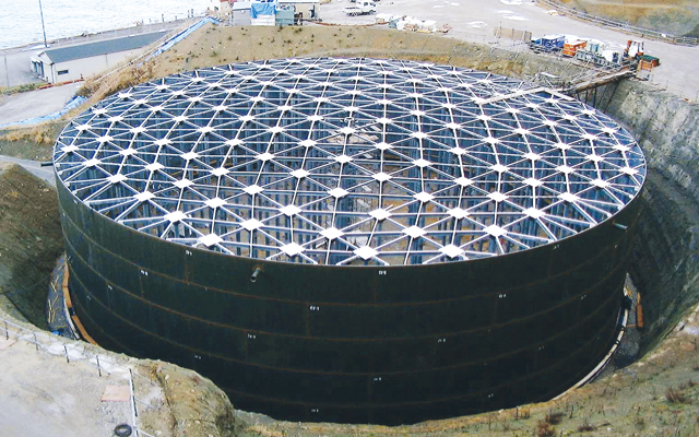 平底大容量構造によりLNG等の極低温液体を長期安定貯蔵。PC外槽・金属二重殻形式に対応し、製作および現地据付工事の実績を有します。
