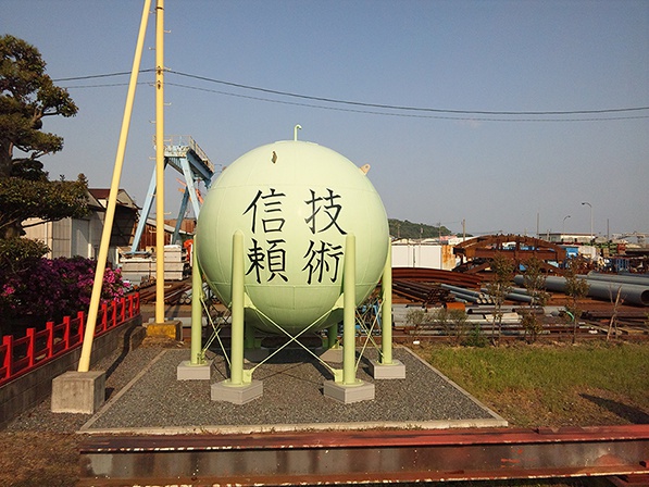 テレビ東京『空から日本を見てみよう』で『大きなけん玉』として紹介された球が球形タンクとして生まれ変わりました。 番組で紹介された『玉』は当社の第1号の球形タンクで、昭和35年頃に製作され、当時は給水塔の水タンクとして使用してきました。 架台の老朽化にともない、給水塔は解体いたしましたが、記念の球形タンクですので塗装し直し、当社のモットーである『信頼』『技術』を日々従業員が意識できるように書いております。